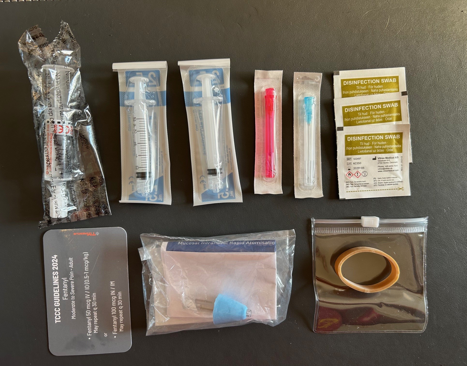 Kit med komplet indhold af forbrugsvarerne til First Line Medication Pouch.